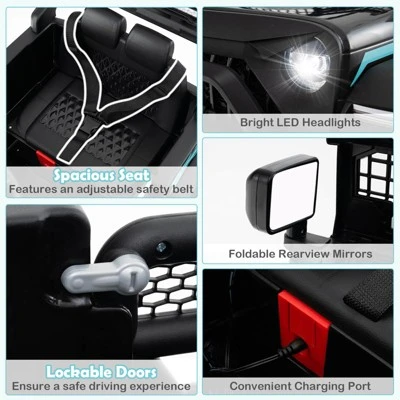 - Entertainment on the Way: Designed with music and a horn sound, this 12V ride on toy invites children to drive for unlimited fun. The bright LED headlights, along with foldable rearview mirrors, add to the realistic experience of driving and make every drive a delightful adventure.