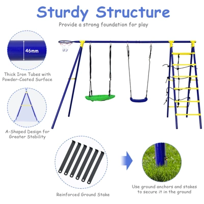 Bring an Ultimate fun Combination for Your Backyard! Our outdoor swing set comes with 2 swings, a basketball hoop, a climbing ladder, and a climbing net which can provide various fun and release kids’ playful nature and energy. Thanks to the heavy-duty power-coated steel pipes and A-shape frame, the swing set showcases great stability and durability. Besides, the saucer swing is made of weather-resistant oxford fabric and the other swing is made of high-density and durable PE materials, so this swing set is safe for kids to play with. Height of both swings can be adjusted with carabiners. Other than that, the pipes are tightly connected by solid tip nut covers and 4 strong ground stakes included which guarantee great safety!
