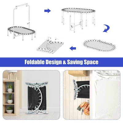 - Enjoyable Jumping Experience: Equipped with 32 springs which are firmly attached between the jumping mat and the frame, this fitness trampoline can not only prevent deformation, but also enjoy a long service life with great durability. In addition, the PP jumping mat with high elasticity will offer you the most excited jumping feelings.