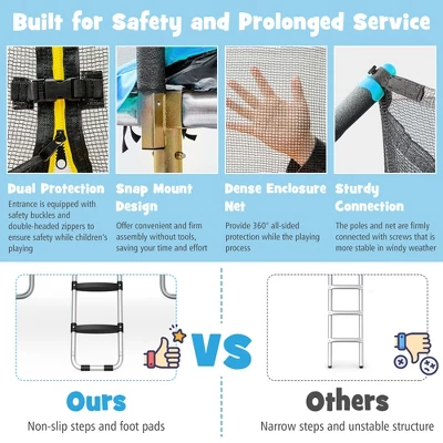 Certified by ASTM,our trampoline is surely a reliable choice for you and your family. Comparing to those trampolines with straight poles,our trampoline with curved poles features ample safety space between the net and poles,protecting kids from getting injured in case of falling. The safety pad and enclosure net offer complete safety protection during jumping. And the non-slip ladder is safe to climb and the entrance is designed with safety buckles and double-headed zippers to prevent accidental opening. Constructed with hot-dip and double-side galvanized steel pipes,this trampoline features outstanding wear and rust resistance,which is capable of long lasting outdoor use.