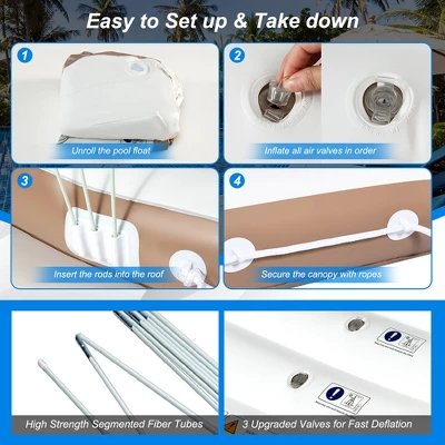 Enjoy a cool and fun summer day on our pool float with canopy! The canopy is crafted of 190T silver-coated fabric with UPF50+ to protect you from harmful rays. In addition, you can adjust the canopy to get comfortable shade without dazzling bright sunlight or remove the canopy to be used as an outdoor inflatable lounge chair. The combination of the spacious seat, ergonomic backrests, and armrests provides you with a cozy user experience. Premium PVC material and sturdy segmented fiber tubes make sure it can accompany you for a long time. This canopy island only takes a few minutes to inflate and deflate, greatly saving your precious time. It will undoubtedly be a perfect complement to any outdoor activities, such as sunbath and pool parties, etc.