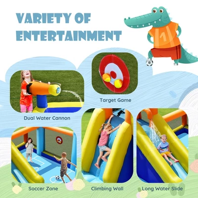 - Durable Oxford Cloth: To withstand more intense jumps, the water slide is crafted of 420D+840D oxford cloth with excellent tear resistance and wear resistance. More, the large soccer zone is surrounded by see-through mesh wall which will not only avoid inflatable soccer being kicked away but also protect kids from falling.