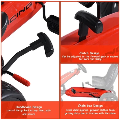 Our latest Go Kart is an ideal option for you as a present to your kids! Let your kids cruise freely! Designed with speedy racing style and flashy details for lightning-quick look! It features heavy duty metal frame with high backed bucket seat, providing maximum safety and comfort. They can control the speed with pedal and brakes. Control the go kart by steering wheel to move forward/backward. Your kids can pull back the hand break next to the seat to stop this go kart. The gear lever is also included which is located on the middle of chain guard. Normally use the go kart when the gear lever pull forward. The pedal go kart is a combination of excitement, safety, and drivability. Surprise your children today!