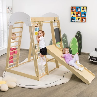- 8-in-1 Toddler Climbing Playset: Our indoor playground climbing gym includes slide, climbing rock, crawling ladder, climbing net, monkey bars, horizontal bar, drawing board, abacus game and swing, offering endless fun for children to play. In addition, both sides of the slide can be used according to your needs.