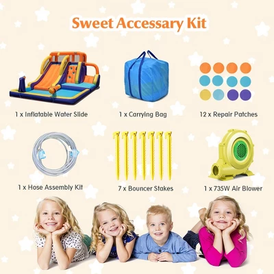 - Sweet Accessory Kit: The climb & slide water park also comes with sweet accessory kit, including a carrying bag, 12 repair patches, 7 bouncer stakes and a hose assembly kit. The complete accessories will somehow help with the bounce castle’s setup and daily maintenance.