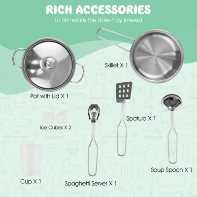 - Complete Accessories & Ample Storage Space: The pretend chef play set comes with a full range of cooking accessories, including 3 kitchen utensils, 1 pot, 1 skillet, 1 cup and 2 ice cubes. Meanwhile, there are many storage cabinets and 3 hanging hooks to help children store the cookware in order.