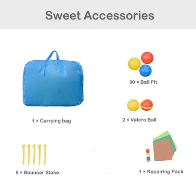 - Detailed Product Information: The bounce house after inflated measures 12.5 ft (L) X 11.5 ft (D) X 7.5ft (H). And it is sold with a pack of repairing, a carrying bag, 2 Velcro balls, 30 ball pits and 5 bouncer stakes.(740W air blower is not included) Recommended age: 3 to 10 years old.
