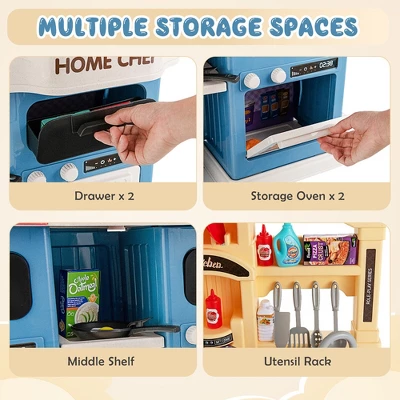 - 69 PCS Cooking Accessories: Our kid’s play kitchen has 69 pcs cooking accessories, including simulated kitchen utensils, seasonings and food, offering kids all they need and bringing them hours of fun. Kids can use rich kitchen accessories to pretend to cook food and wash different ingredients. With multiple kitchen utensils, they can choose to play alone or share this play toy with friends.
