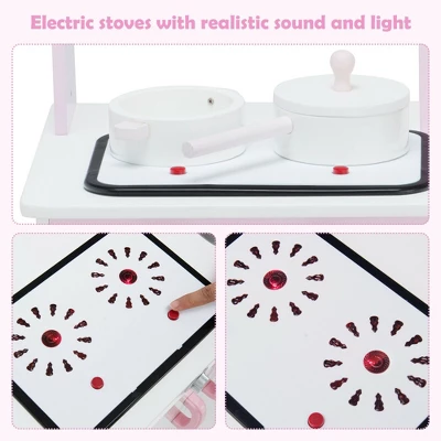 - Realistic Appliances: This wooden kitchen play set is designed with a simulated stove, featuring 2 rotary knobs with click sound. The stovetop also features lively simulating fire lights to add more role-playing fun. More, it also has a water faucet, a simulated oven, and a cupboard, which is perfect for engaging in social play and pretending to wash, bake, and more!