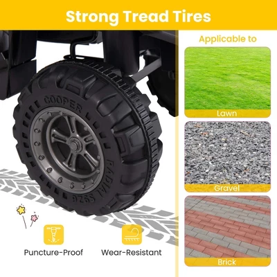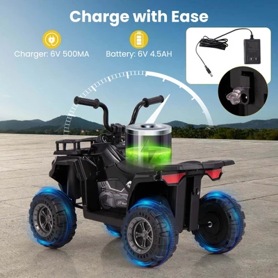 - Authentic Driving Design: Experience endless fun with the ride-on ATV, outfitted with 4 treaded tires that ensure a stable ride on various surfaces, from lawn to brick floor. In addition, it has a cool spoiler and LED headlights for an extra dash of style.