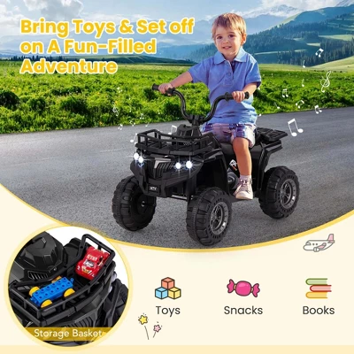 - Music & Added Storage: The electric ATV contains an integrated MP3 player, allowing your little one to groove to their favorite tracks. Besides, the handy storage basket is perfect for carrying toys, snacks, books, and all the essentials for every journey.