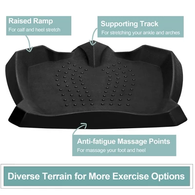 - Diverse Terrain for More Exercise Options: Users can use the raised ramp in the middle to relieve muscle tension in the heel and stretch out your calf muscles. Also, the supporting tracks on both side help you stretch ankles and arches. Moreover, the anti-fatigue massage points allows you to massage your feet and heel during standing.