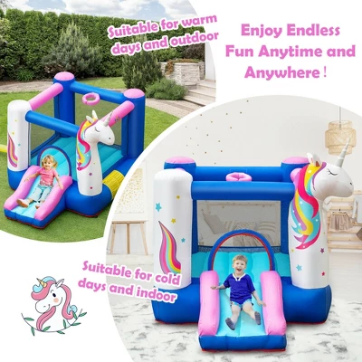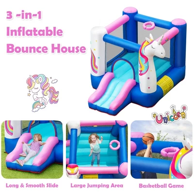 Our lovely unicorn inflatable bounce house is a perfect gift for your kids! The cute unicorn style will make children fall in love with this bounce house instantly and provide a happy childhood for them. Children can jump, slide and play basketball in different playing areas to explore more fun. Made from non-toxic and durable oxford cloth material, this inflatable jumping castle is stable and secure enough for long-lasting use. Besides, the breathable mesh netting wall will provide a safe playing environment for your kids. The inflation is very easy, just to use a bower to set up the bounce house in minutes and fix it with ground stakes. And the included carry bag allows you to carry the bounce house outdoors freely and conveniently.