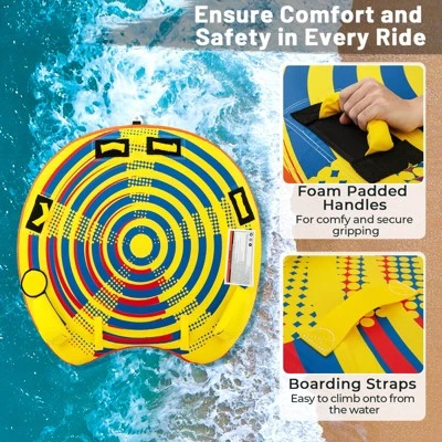 - Safe and Comfortable Riding Experience: The tubing boat is equipped with foam padded handles for comfy and secure gripping, coupled with boarding straps, making it easy to climb onto from the water. Additionally, the awesome bumper fins assist in maintaining a centered position during challenging turns and navigating through wake.