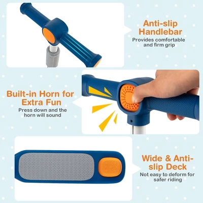 - LED Flashing Wheels & Built-in Horn: The front and rear wheels will light up to give kids a funny and cool riding and there is no need for batteries or electricity. High elastic and wear-resistant PU wheels with ABEC-7 ball bearings make the scooter suitable for different kinds of ground. Moreover, the built-in horn provides extra fun and security while riding.
